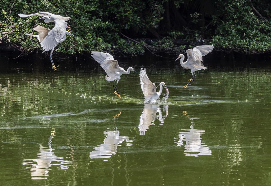 4月15日,攝于南山區(qū)華僑城天鵝堡附近。這是深圳拍鷺鳥的其中一個好去處。四只白鷺在水面上爭相捕食。徐捷攝