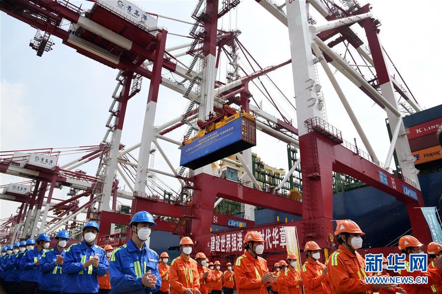 4月26日,在青島港前灣碼頭,碼頭工人參加“現(xiàn)代商船阿爾赫西拉斯”輪首航儀式。當(dāng)日,載箱量可達(dá)2.4萬標(biāo)準(zhǔn)箱的世界最大集裝箱船“現(xiàn)代商船阿爾赫西拉斯”輪從山東青島港開啟首航,這條船的甲板面積超過2.4萬平方米,相當(dāng)于3.5個(gè)標(biāo)準(zhǔn)足球場(chǎng)大小。新華社記者李紫恒攝
