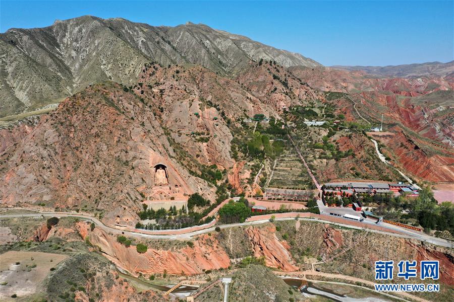 這是4月27日拍攝的寧夏須彌山石窟景觀(無人機照片)。新華社記者王鵬攝