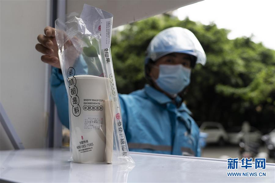 4月22日,在四川省成都市的一家小區(qū)無接觸配送點,邱有哈子配送奶茶。新華社記者 李夢馨 攝