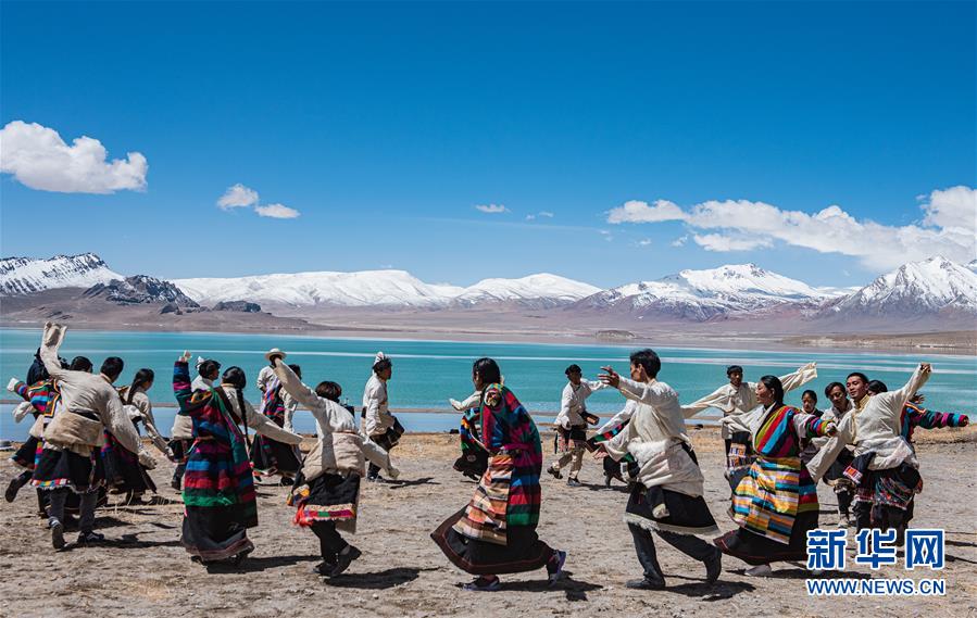 4月30日,牧民在當(dāng)穹錯湖畔跳鍋莊舞。當(dāng)穹錯地處西藏那曲市尼瑪縣南部,湖面海拔4475米。暮春時節(jié),湖水碧藍清亮,讓人仿佛置身仙境。新華社記者侯捷攝