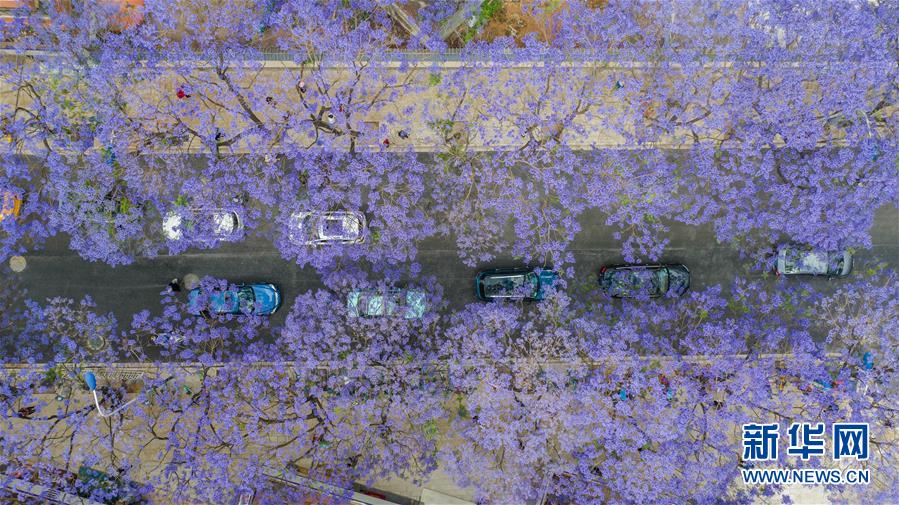 這是5月2日在昆明市教場(chǎng)中路拍攝的藍(lán)花楹(無(wú)人機(jī)照片)。近日,云南省昆明市部分街區(qū)的藍(lán)花楹競(jìng)相開放,為春城增添靚麗風(fēng)景。新華社記者胡超攝