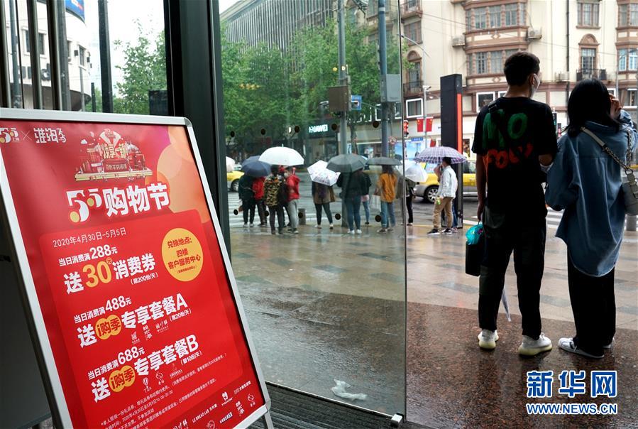 上?;春B芬患疑虉?chǎng)布置的“五五購物節(jié)”活動(dòng)信息(5月5日攝)。5月4日晚,上海首次啟動(dòng)大規(guī)模商業(yè)促銷活動(dòng)“五五購物節(jié)”,多家在線新經(jīng)濟(jì)企業(yè)參與,通過線上流量?jī)?yōu)勢(shì)反哺線下賣場(chǎng),實(shí)現(xiàn)電商與實(shí)體零售融合互動(dòng),激活消費(fèi)潛力、驅(qū)動(dòng)消費(fèi)復(fù)蘇。據(jù)“上海發(fā)布”的消息,截至5日14時(shí)12分,“五五購物節(jié)”上海地區(qū)消費(fèi)支付總額已超100億元。新華社記者劉穎攝