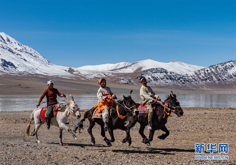 西藏那曲市尼瑪縣文部鄉(xiāng)北村的村民們騎馬在當(dāng)穹錯(cuò)旁角逐(4月30日攝)。新華社記者侯捷攝