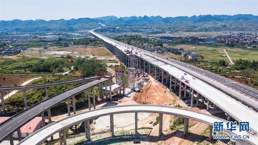 都安高速改擴(kuò)建路段的惠水特大橋與惠水樞紐(無(wú)人機(jī)照片,5月9日攝)。 新華社記者 陶亮 攝