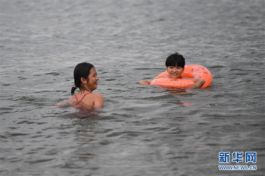 5月10日,小朋友在??谖餍愫┩嫠!=?,??诔掷m(xù)高溫,不少市民前往海灘戲水消暑。新華社記者蒲曉旭攝