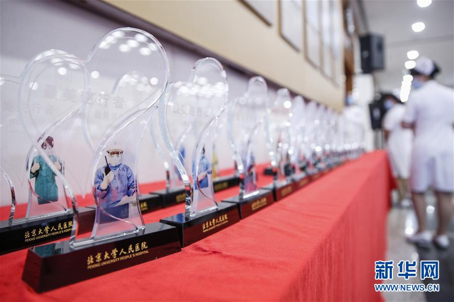 5月11日,工作人員整理印有援鄂隊(duì)員工作照的獎(jiǎng)杯。在國(guó)際護(hù)士節(jié)到來(lái)之際,北京大學(xué)人民醫(yī)院11日舉辦慶祝護(hù)士節(jié)暨優(yōu)秀集體和個(gè)人表彰活動(dòng),并邀請(qǐng)?jiān)踽t(yī)療隊(duì)護(hù)士代表分享戰(zhàn)“疫”故事。我國(guó)今年護(hù)士節(jié)的主題為“致敬護(hù)士隊(duì)伍,攜手戰(zhàn)勝疫情”。新華社記者張玉薇攝