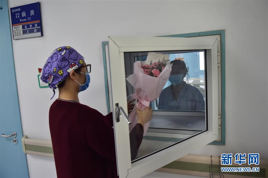 5月11日,在北京地壇醫(yī)院感染二科病房外,一名護(hù)士向病人轉(zhuǎn)交病人女兒送來的鮮花。北京地壇醫(yī)院是北京市收治新冠肺炎患者的定點(diǎn)醫(yī)院之一,醫(yī)院的醫(yī)護(hù)人員一直奮戰(zhàn)在抗擊疫情的一線。在國際護(hù)士節(jié)前夕,記者前往北京地壇醫(yī)院,記錄下抗疫一線護(hù)士的日常工作狀態(tài)。新華社記者彭子洋攝