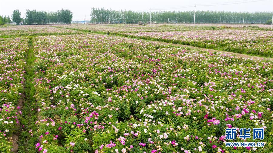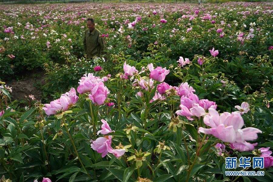 工作人員在金湖縣金燦芍藥園里進行農(nóng)業(yè)管理(5月11日攝)。新華社記者韓瑜慶攝