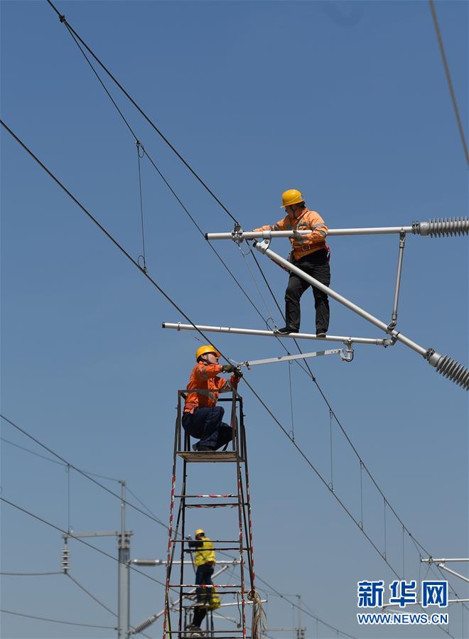5月12日,中國鐵路上海局集團公司上海高鐵維修段的技術(shù)人員在商合杭高鐵浙江湖州段調(diào)整接觸網(wǎng)導(dǎo)線。近日,商合杭高鐵合肥至湖州段聯(lián)調(diào)聯(lián)試正有條不紊進行中。中國鐵路上海局集團公司上海高鐵維修段抽調(diào)49名精兵強將,持續(xù)對管轄范圍內(nèi)的高鐵線路、信號、接觸網(wǎng)線進行調(diào)試,為下一階段打下基礎(chǔ)。據(jù)了解,商合杭高鐵合湖段聯(lián)調(diào)聯(lián)試之后將轉(zhuǎn)入運行試驗階段,驗收合格并通過安全評估后,力爭6月底具備開通運營條件。新華社記者黃宗治攝