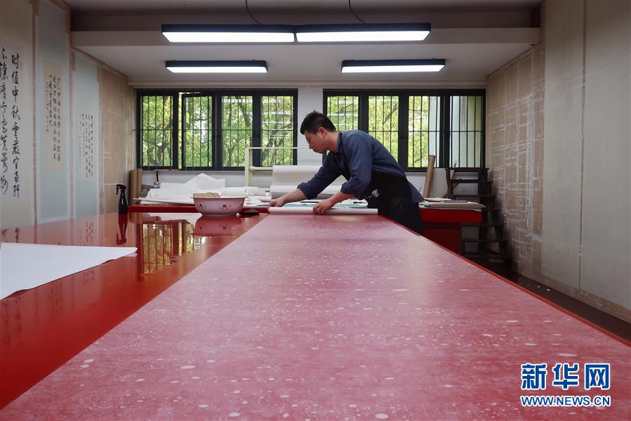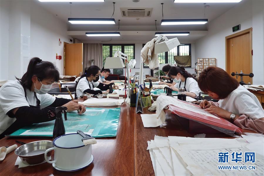 5月13日,古籍修復(fù)師在對(duì)書畫作品進(jìn)行裝裱操作。天一閣藏品修復(fù)部目前有修復(fù)師14人,每年約修復(fù)古籍14000余頁(yè)。據(jù)介紹,修復(fù)一冊(cè)古籍通常需要1至2個(gè)月,有的甚至需要1年以上。新華社記者鄭夢(mèng)雨攝