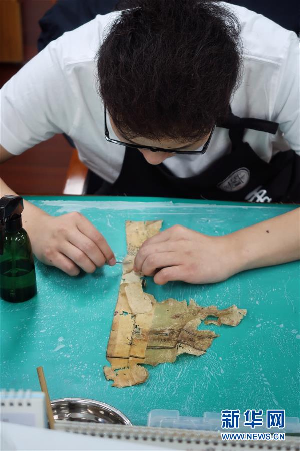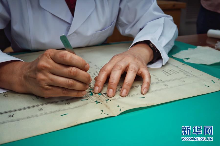 5月13日,天一閣藏品修復(fù)部主任王金玉在對(duì)書頁(yè)進(jìn)行修復(fù)。天一閣藏品修復(fù)部目前有修復(fù)師14人,每年約修復(fù)古籍14000余頁(yè)。據(jù)介紹,修復(fù)一冊(cè)古籍通常需要1至2個(gè)月,有的甚至需要1年以上。新華社記者鄭夢(mèng)雨攝