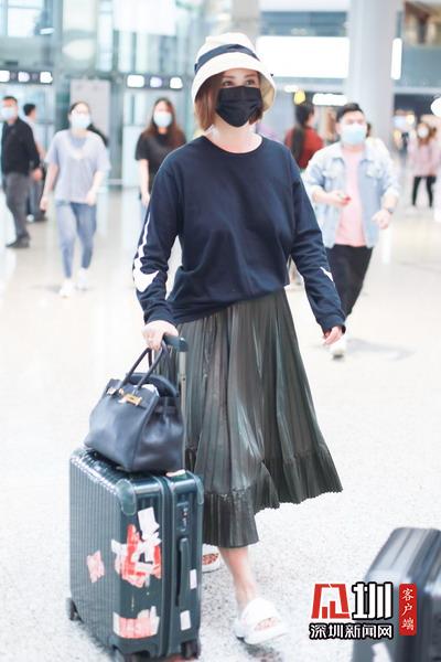2020年5月14日,上海,張歆藝現(xiàn)身機場。她頭戴遮陽帽,口罩遮面,穿著黑色長袖T恤搭配百褶長裙,自提行李箱現(xiàn)身機場,獲粉絲送機,揮手道別。