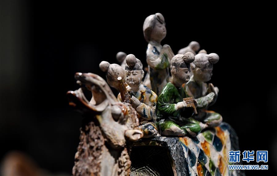 這是在陜西歷史博物館展出的唐三彩駱駝載樂俑(3月25日攝)。新華社記者 李一博 攝