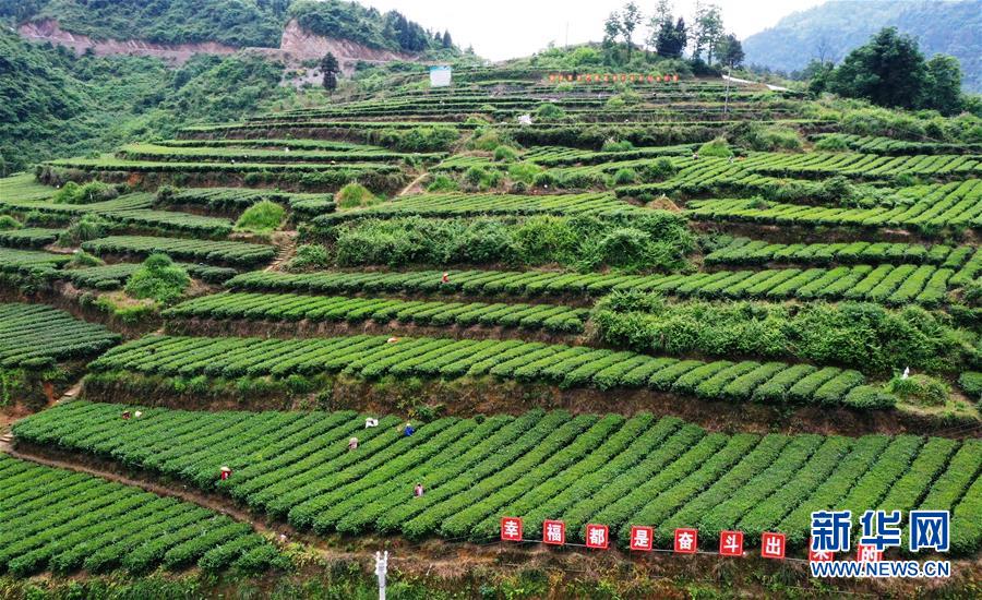 5月17日,村民在新院村茶葉基地采摘夏茶(無人機照片)。新華社記者王全超攝