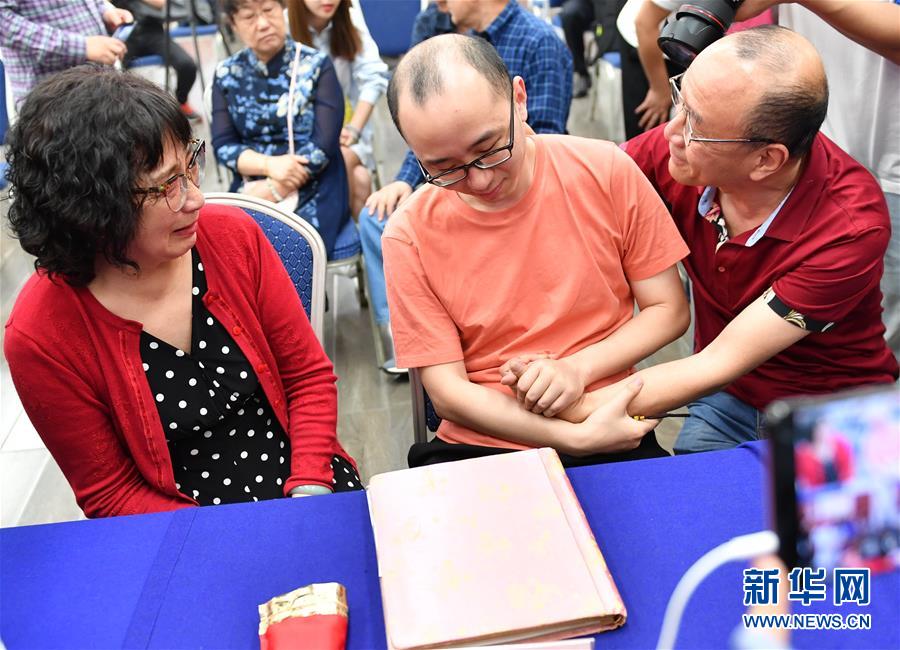 5月18日,李靜芝(左)、毛振平(右)與失散32年的兒子毛寅團(tuán)聚。新華社記者張博文攝