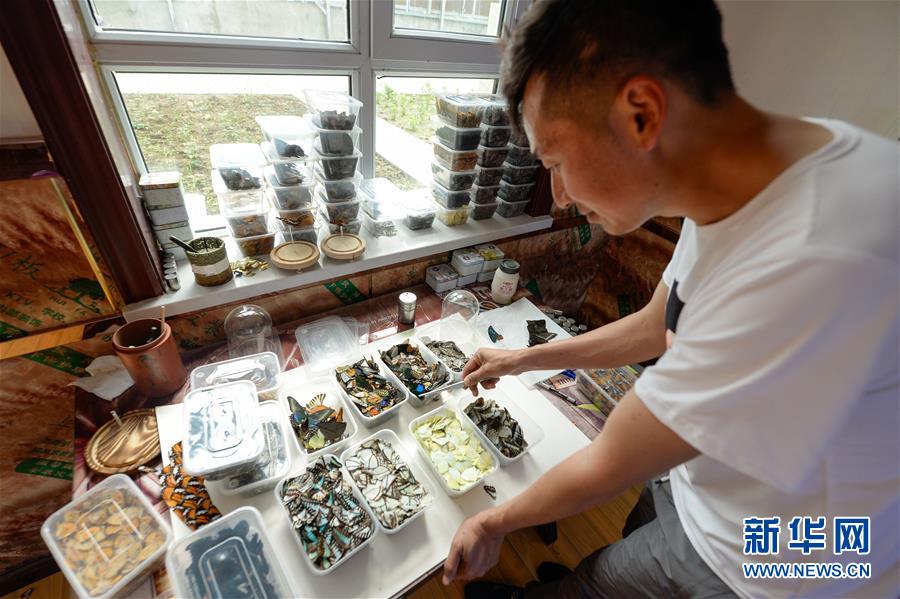 在吉木薩爾縣七彩蝶園,關(guān)富云在制作蝴蝶標(biāo)本(5月15日攝)。走進(jìn)關(guān)富云的七彩蝶園,游客不僅可以近距離接觸翩翩起舞的蝴蝶,還可以欣賞蝴蝶破繭成蝶的蛻變過程。今年34歲的關(guān)富云用9年的時(shí)間實(shí)現(xiàn)了自己的“蝴蝶夢(mèng)”,完成美麗的“蝶變”。關(guān)富云家住新疆吉木薩爾縣北地社區(qū)。2011年,他看到一檔農(nóng)業(yè)致富節(jié)目,萌生了養(yǎng)殖蝴蝶的想法。關(guān)富云說,當(dāng)時(shí)蝴蝶養(yǎng)殖還是一種新興產(chǎn)業(yè),他抱著試一試的想法,在海南學(xué)習(xí)了3個(gè)月蝴蝶養(yǎng)殖,帶回100多個(gè)蝶蛹在家試驗(yàn)養(yǎng)殖。蝴蝶的生存周期短,在當(dāng)?shù)仞B(yǎng)殖需要克服溫度、濕度、病蟲害等問題。關(guān)富云不斷嘗試,越挫越勇,羽化成功的蝴蝶在2014年終于突破了萬只。蝴蝶的色彩艷麗,活體蝴蝶可用于婚慶、開業(yè)慶典等活動(dòng)中放飛,可以取得很好的收益。但它的生命短暫,如何才能最大化蝴蝶的效益,留住它的美呢?關(guān)富云動(dòng)起了心思,開始嘗試制作標(biāo)本和蝶翅畫?!昂宛B(yǎng)殖不同,做蝶翅畫是個(gè)創(chuàng)作的過程,從選擇標(biāo)本到粘貼,每一步都要突出美感?!标P(guān)富云介紹,一幅色彩明艷、栩栩如生的蝶翅畫耗時(shí)多日才能完成。如今,關(guān)富云的活體蝴蝶和蝶翅畫通過線上線下銷售,產(chǎn)品還銷往北京、廈門等地。關(guān)富云的蝴蝶產(chǎn)品得到市場的認(rèn)可,政府也對(duì)他給予大力支持。2019年,吉木薩爾縣在泉子街鎮(zhèn)建起蝴蝶觀賞園,吸引了不少游客到此參觀游玩。對(duì)于未來的發(fā)展,關(guān)富云信心滿滿,“我希望把蝴蝶產(chǎn)業(yè)發(fā)展到天山南北,讓人們?cè)诤涞亩疽材苡^賞到蝴蝶,并且讓更多人參與其中,致富脫貧”。新華社記者丁磊攝