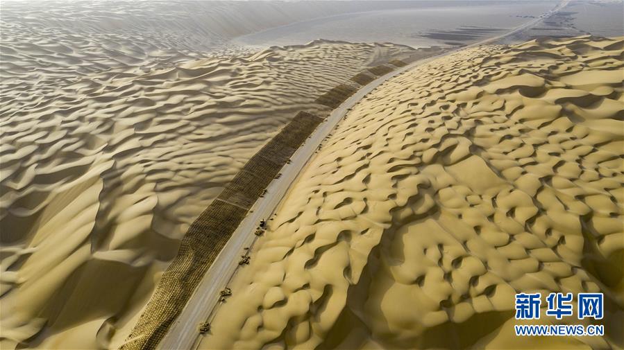 這是建設(shè)中的新疆尉犁至且末沙漠公路(無人機(jī)照片,5月17日攝)。