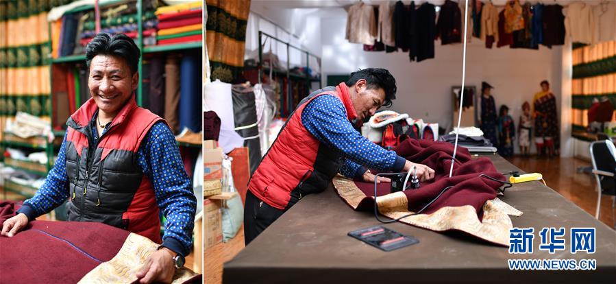 拼版照片:左圖為西藏昌都市江達(dá)縣字嘎鄉(xiāng)塔字村村民扎西江措;右圖為扎西江措在西藏昌都市江達(dá)縣格桑花民族服飾加工銷售公司制作藏裝。扎西江措學(xué)習(xí)藏裝縫制不到兩年時間,已經(jīng)是一名熟練的制衣工,現(xiàn)在月收入4000多元。在此之前,扎西江措靠放牧、四處打零工養(yǎng)活一家人(4月30日攝)。新華社記者詹彥攝
