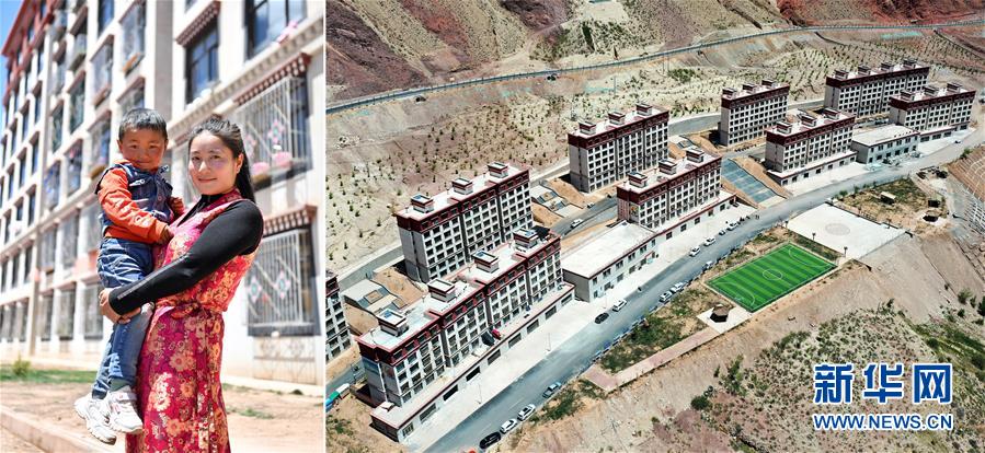 拼版照片:左圖為西藏昌都市八宿縣夏里鄉(xiāng)吉熱村村民次日措姆和兒子加擁羅布在安置點(diǎn)樓前;右圖為八宿縣乃然易地扶貧搬遷安置點(diǎn)一角(無人機(jī)照片)。2018年,次日措姆和家人搬遷到乃然易地扶貧搬遷安置點(diǎn),住進(jìn)了75平方米的新居。次日措姆還在安置點(diǎn)找到一份保潔員工作,每月有1900元的收入 (5月10日攝)。新華社記者詹彥攝