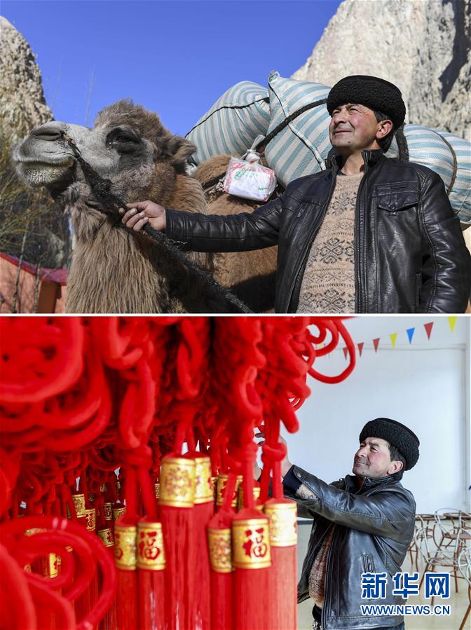 拼版照片上圖:都熱·加爾曼牽著馱有搬遷行李的駱駝走在喀喇昆侖山中(2018年11月17日攝);在塔什庫爾干塔吉克自治縣塔提庫力易地扶貧搬遷安置點(diǎn)的衛(wèi)星工廠,都熱·加爾曼在參觀由村民編制的手工藝品,他計(jì)劃讓妻子來這里上班(2018年11月18日攝)。2018年以來,新疆塔什庫爾干塔吉克自治縣對居住在艱苦偏遠(yuǎn)山區(qū)、生產(chǎn)生活資料匱乏、難以實(shí)現(xiàn)就地脫貧的358戶貧困戶,陸續(xù)實(shí)施易地扶貧搬遷,搬遷至距縣城約25公里的塔提庫力易地扶貧搬遷安置點(diǎn)。安置點(diǎn)還開發(fā)了耕地、草場,建有衛(wèi)星工廠,確保像都熱一樣的貧困戶能穩(wěn)步增收脫貧。黨的十八大以來,我們堅(jiān)持以人民為中心的發(fā)展思想,明確了到2020年我國現(xiàn)行標(biāo)準(zhǔn)下農(nóng)村貧困人口實(shí)現(xiàn)脫貧、貧困縣全部摘帽、解決區(qū)域性整體貧困的目標(biāo)任務(wù)。目前看,脫貧進(jìn)度符合預(yù)期,成就舉世矚目。這些成績的取得,凝聚了全黨全國各族人民智慧和心血,是廣大干部群眾扎扎實(shí)實(shí)干出來的。脫貧摘帽不是終點(diǎn),而是新生活、新奮斗的起點(diǎn)。新華社記者胡虎虎攝
