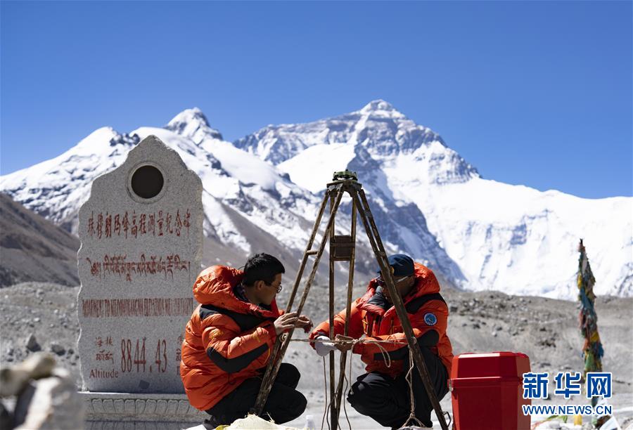 國測一大隊(duì)隊(duì)員在珠峰大本營附近測試設(shè)備(5月17日攝)。新華社記者普布扎西攝