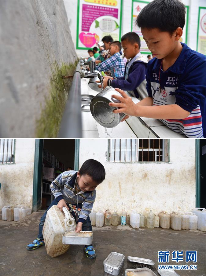 這是一張拼版照片。上圖:在大化瑤族自治縣板升鄉(xiāng)八好小學(xué),同學(xué)們?cè)谟萌赐耄?019年5月7日攝)。下圖:八好小學(xué)的同學(xué)們用儲(chǔ)備在水桶里的雨水淘米煮飯(2014年11月24日攝)。八好小學(xué)有400多名學(xué)生,曾僅有一個(gè)不足100立方米的水柜,用于收集儲(chǔ)存樓頂?shù)挠晁?,學(xué)生需定期定量用水。遇到長(zhǎng)時(shí)間不下雨,學(xué)校需要到鄉(xiāng)政府所在地運(yùn)水。如今,學(xué)校修建了5個(gè)大水柜,并從兩公里外引泉水到校園,“飲水難”問(wèn)題得到解決。新華社記者黃孝邦攝