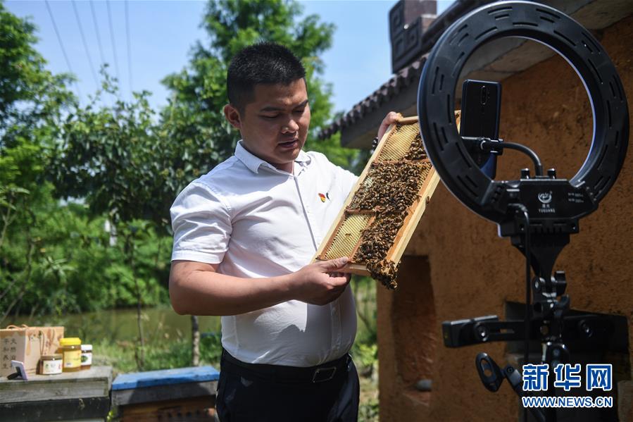 5月20日,長(zhǎng)興縣林城鎮(zhèn)畎橋村的意蜂蜂業(yè)幫扶基地內(nèi),養(yǎng)蜂能手邱凱在進(jìn)行網(wǎng)上直播,介紹當(dāng)?shù)孛鄯漯B(yǎng)殖特色及相關(guān)蜂產(chǎn)品。新華社記者徐昱攝