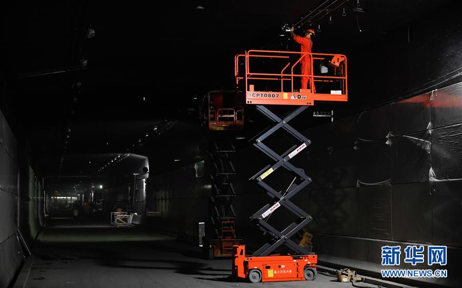 5月23日,工人在??谖拿鳀|越江通道項(xiàng)目隧道內(nèi)安裝照明設(shè)備。新華社記者楊冠宇攝
