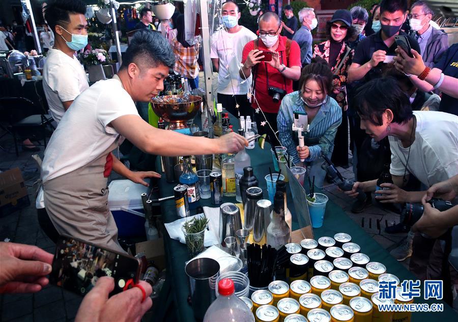 5月24日,調(diào)酒師在上海思南公館露天夜市進(jìn)行網(wǎng)絡(luò)直播。入夏以來,上海思南公館推出“思南夜派對”夜間經(jīng)濟(jì)大排檔,包括生活市集、深夜食堂、夜游露天博物館等板塊,匯集了國潮品牌、創(chuàng)意美食、藝術(shù)衍生品等攤位,為公眾帶來一站式夜間休閑“加油站”,促進(jìn)夜間消費。新華社記者陳飛攝