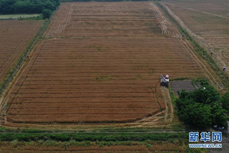 5月24日,農(nóng)戶駕駛收割機(jī)在浙江省湖州市吳興區(qū)八里店鎮(zhèn)尹家圩糧油植保農(nóng)機(jī)專業(yè)合作社的麥田里進(jìn)行收割作業(yè)(無(wú)人機(jī)照片)。新華社記者黃宗治攝
