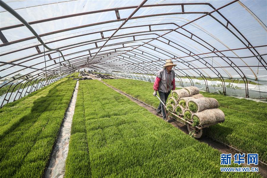 5月24日,盤(pán)錦市大洼區(qū)的農(nóng)民在育苗棚內(nèi)搬運(yùn)符合插秧標(biāo)準(zhǔn)的水稻秧苗。新華社記者潘昱龍攝