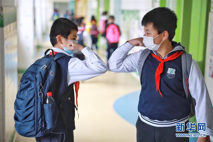5月25日,北京市朝陽(yáng)區(qū)實(shí)驗(yàn)小學(xué)貴陽(yáng)分校的兩個(gè)孩子用“碰肘”的方式打招呼。新華社記者劉續(xù)攝