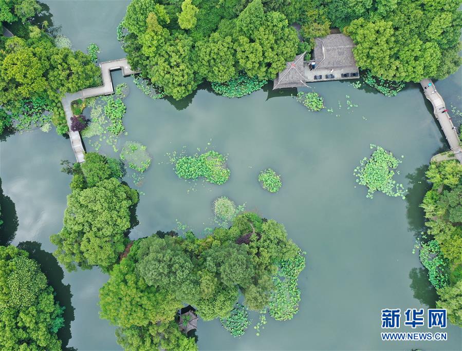 5月27日,游人在西湖曲院風荷景區(qū)游覽(無人機照片)。隨著氣溫升高,杭州西湖綠意蔥蘢,展現(xiàn)出柔美的湖光山色。新華社記者翁忻旸攝