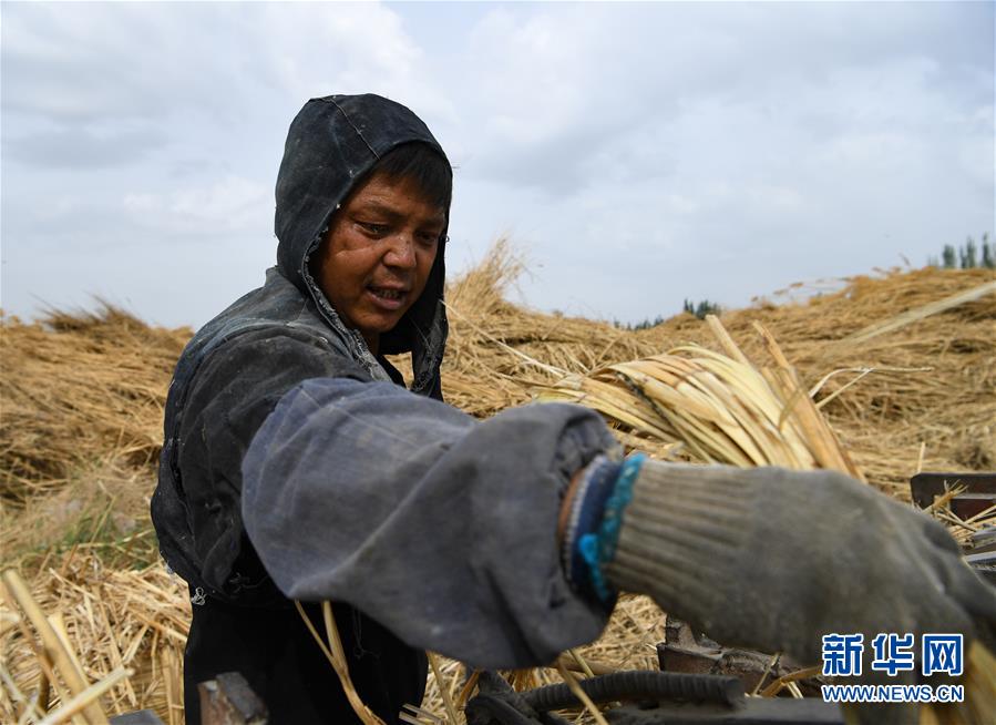 5月20日,在新疆博湖縣西南河口葦場,工人將蘆葦打包。新華社記者宋彥樺攝