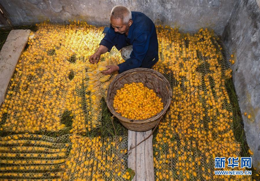 5月27日,桐鄉(xiāng)市鳳鳴街道建勝村70歲的村民宋柏明在收獲“黃金繭”。他今年在桐鄉(xiāng)興民蠶業(yè)專業(yè)合作社的指導(dǎo)下首次養(yǎng)3張黃金蠶繭種,收獲“黃金繭”近400斤,比往年同期增收1500元。近期,蠶桑之鄉(xiāng)浙江省桐鄉(xiāng)市的蠶農(nóng)們迎來了蠶繭豐收的季節(jié),其中新品種“黃金繭”的增收效果尤其明顯。據(jù)介紹,與普通蠶絲相比,色澤金黃的黃金蠶絲中葉黃素含量高,抗菌效果更好,深受市場青睞。2020年春季,浙江省桐鄉(xiāng)市共計發(fā)放黃金蠶繭種1225張,產(chǎn)量預(yù)計75噸,總產(chǎn)值近300萬元,較普通蠶繭增收約20%,成為當(dāng)?shù)剞r(nóng)業(yè)增收的亮點。浙江省桐鄉(xiāng)市是我國蠶桑的重要產(chǎn)地,“桐鄉(xiāng)蠶桑習(xí)俗”也被國務(wù)院列入第二批國家級非物質(zhì)文化遺產(chǎn)名錄。新華社記者徐昱攝