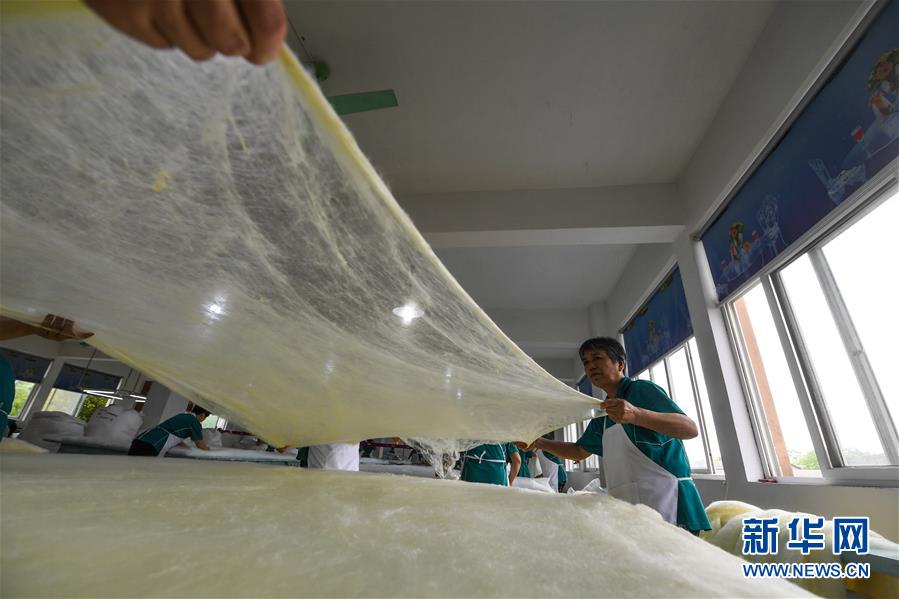 5月27日,在位于桐鄉(xiāng)市洲泉鎮(zhèn)的浙江蠶緣家紡股份有限公司內(nèi),工作人員把加工好的黃金蠶絲進(jìn)行“拉絲綿”工序,準(zhǔn)備用于制作蠶絲被。新華社記者徐昱攝