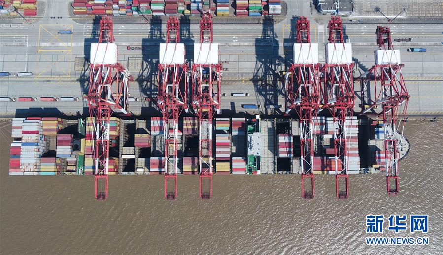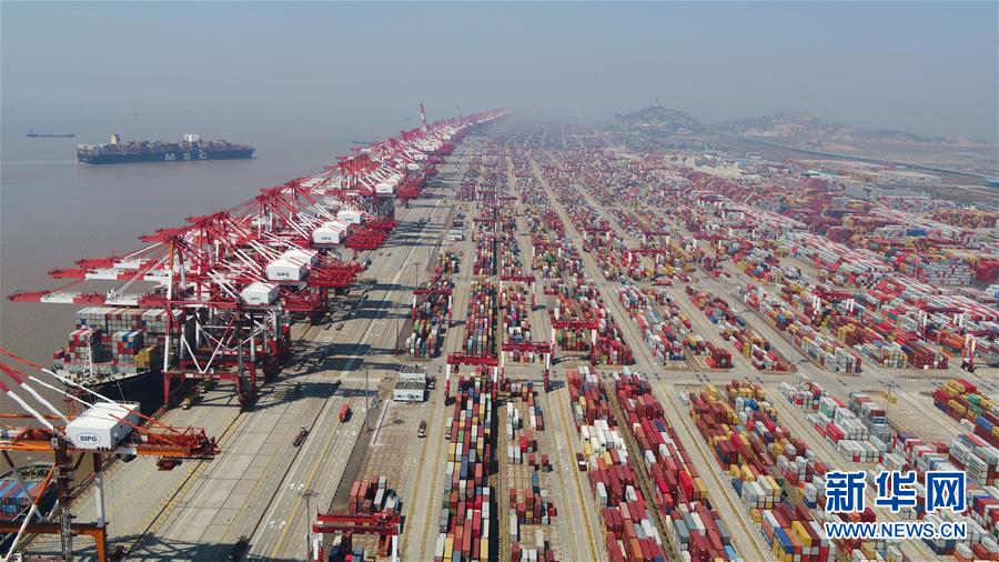 這是3月18日拍攝的上海洋山港集裝箱碼頭(無人機照片)。新華社記者丁汀攝