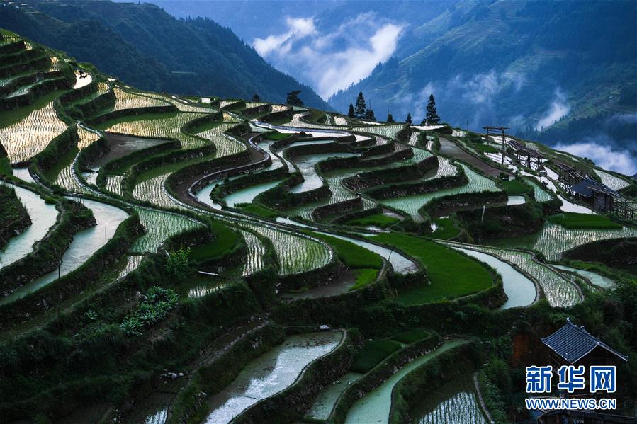 晨光中的從江縣加榜鄉(xiāng)加車梯田(5月27日攝)。夏日時(shí)節(jié),位于貴州省黔東南苗族侗族自治州從江縣加榜鄉(xiāng)加車、加頁(yè)、黨扭等苗寨的梯田在晨霧與陽(yáng)光的映襯下線條分明,光影變幻,景色如畫。新華社記者 楊文斌 攝