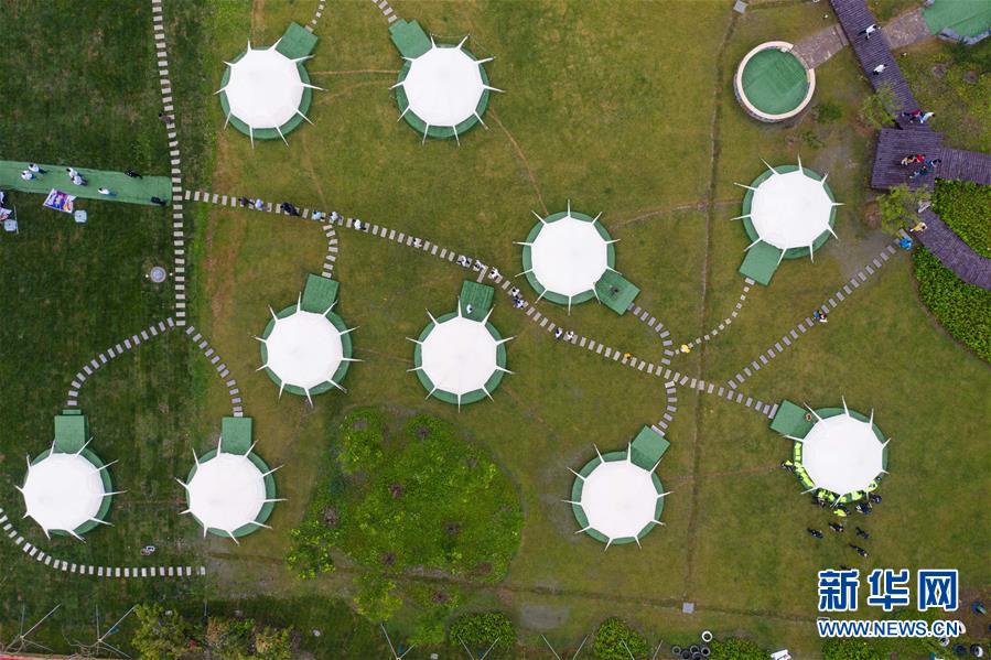 5月31日,空中俯瞰石淙花海內的帳篷露營區(qū)(無人機照片)。新華社記者徐昱攝
