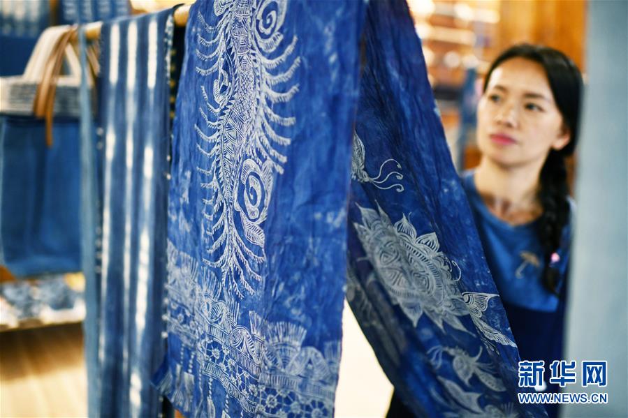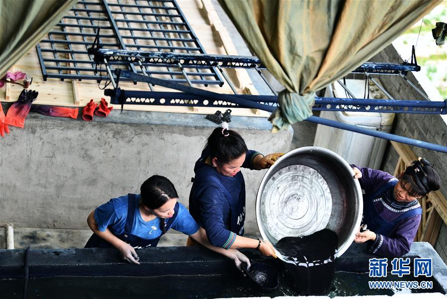 2018年,楊成蘭在村里成立傳統(tǒng)織染合作社,吸引村里及周邊村寨貧困戶入股,帶動當?shù)刎毨艉痛迕窦尤牒献魃纾瑥氖驴棽?、染布、藍靛種植等產(chǎn)業(yè),在傳承民族傳統(tǒng)手工技藝的同時,幫助村民脫貧增收。新華社記者楊文斌攝