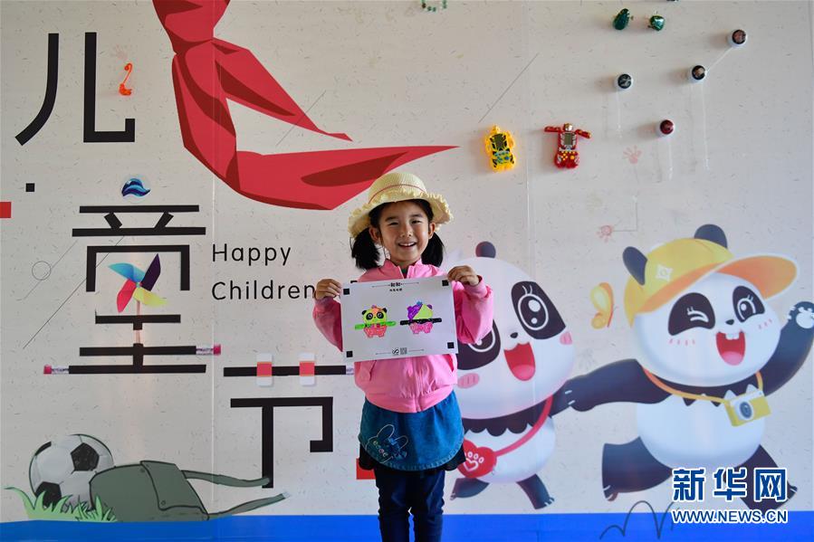 5月31日,一位小朋友在西寧熊貓館內(nèi)展示自己的熊貓主題畫作。新華社記者張龍攝