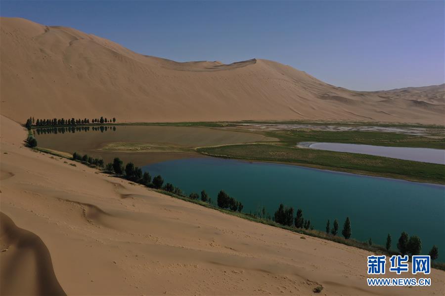 這是5月30日拍攝的巴丹吉林沙漠一處湖泊(無人機照片)。新華社記者徐欽攝。