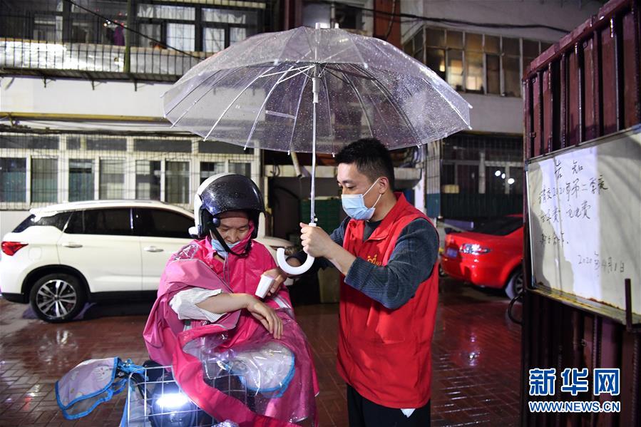 楊龍明在小區(qū)內(nèi)給住戶檢測(cè)體溫(6月1日攝)。新華社記者李然攝。