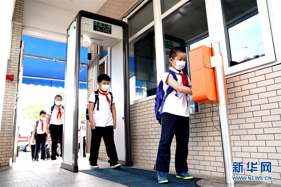 6月2日,上海閔行區(qū)鑫都小學(xué)的學(xué)生走進(jìn)校園。當(dāng)日,上海小學(xué)一、二、三年級(jí)學(xué)生返校開(kāi)學(xué)。新華社記者張建松攝。