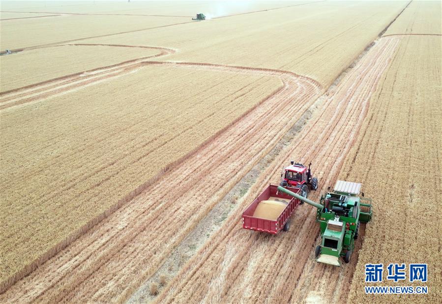 6月2日,在河南省黃泛區(qū)農(nóng)場九分場的麥田里,農(nóng)民操作大型收割機(jī)收獲小麥(無人機(jī)照片)。新華社記者李嘉南攝。