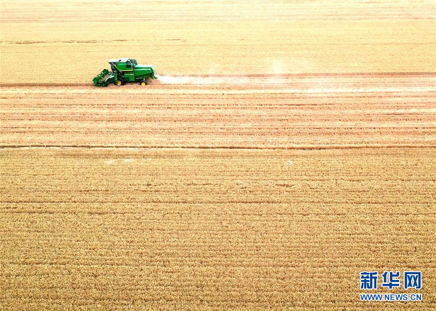 6月2日,在河南省黃泛區(qū)農(nóng)場(chǎng)九分場(chǎng)的麥田里,農(nóng)民操作大型收割機(jī)收獲小麥(無人機(jī)照片)。新華社記者李嘉南攝。