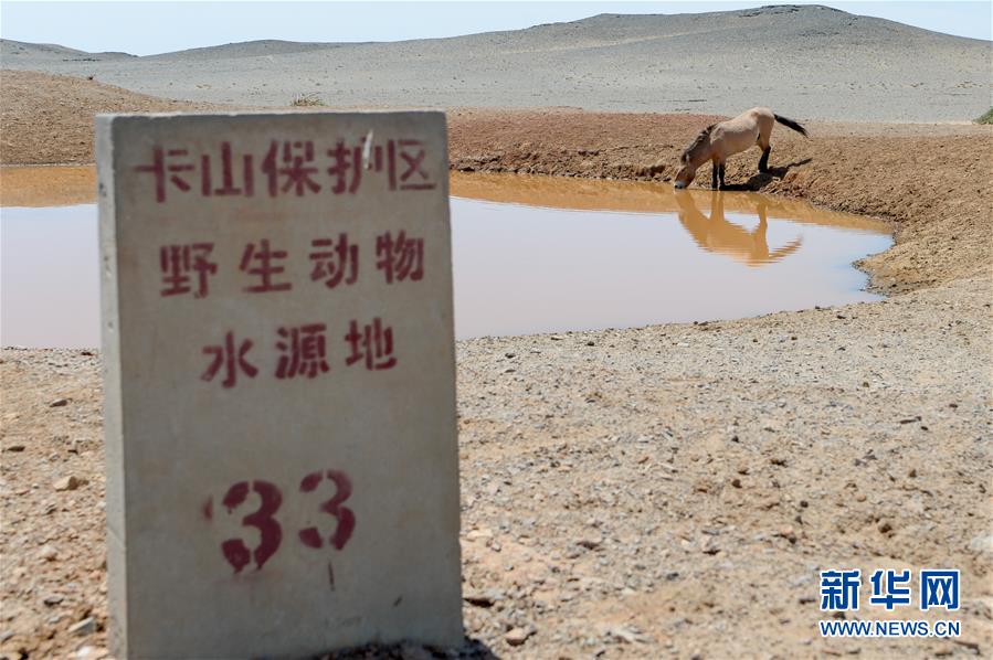 在新疆卡拉麥里山有蹄類野生動物自然保護區(qū),一匹普氏野馬來到33號水源地飲水(6月3日攝)。新華社記者丁磊攝。