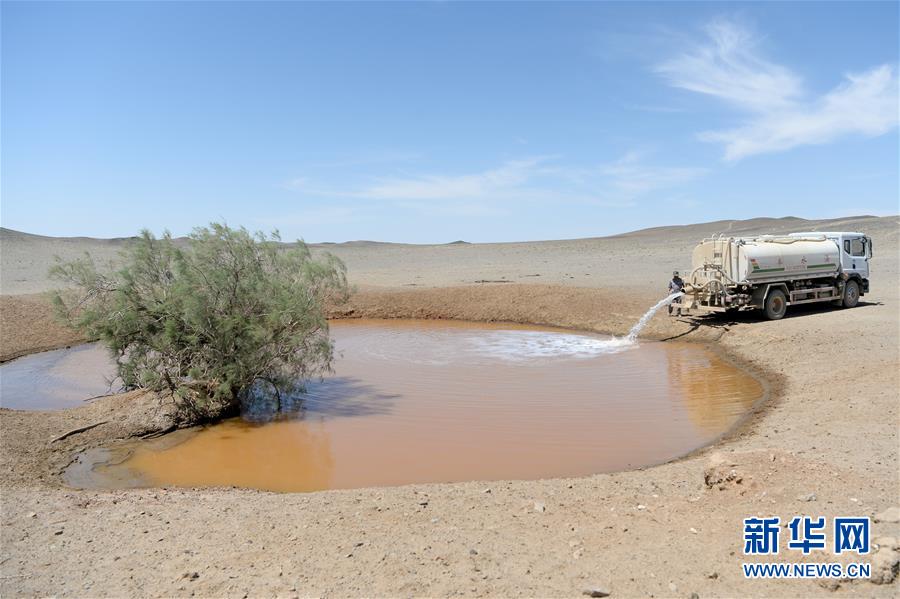 在新疆卡拉麥里山有蹄類野生動(dòng)物自然保護(hù)區(qū),管護(hù)員為水源地灌水(6月3日攝)。新華社記者丁磊攝。