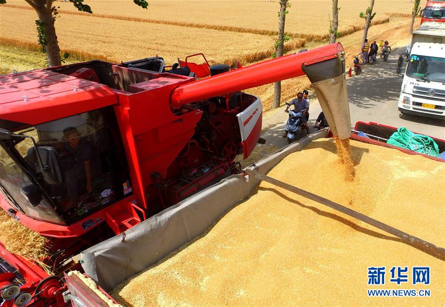 6月8日,在河北省南和縣閆里鄉(xiāng)閆里村,農(nóng)民將收獲的小麥裝車(無人機照片)?!叭摹逼陂g,河北省預(yù)計組織和調(diào)度小麥聯(lián)合收割機、拖拉機、夏玉米播種機等200萬臺農(nóng)業(yè)機械投入作業(yè)。新華社記者朱旭東攝